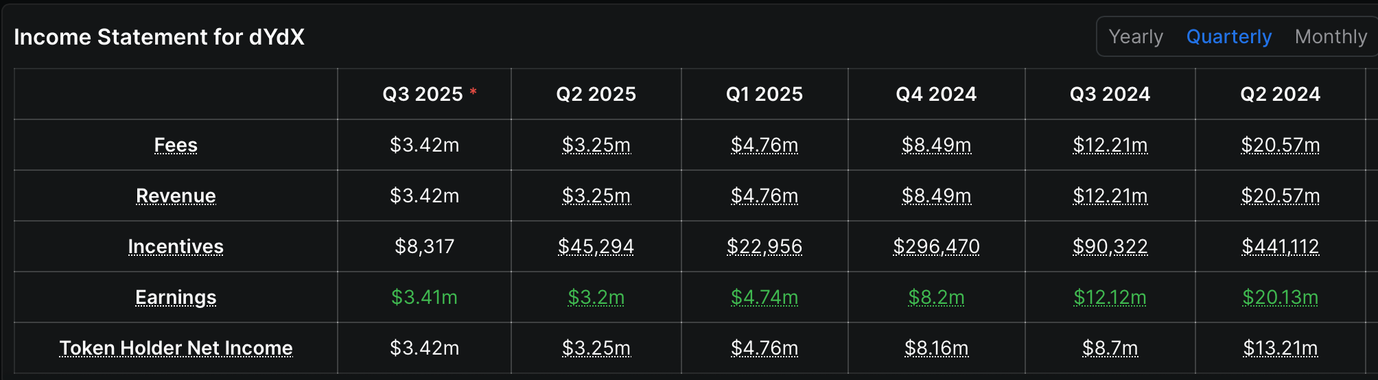 去中心化交易所dYdX更新了其2025年路线图,概述了在平台面临收益下降的情况下推出Telegram交易整合的计划。 根据路线图,dYdX计划推出一系列软件升级,包括合作伙伴费用分成、规模和TWAP订单以及指定提议者,旨在减少端到端交易延迟。 此外,DEX计划在9月份推出基于Telegram的交易,这是由于其7月份收购了社交交易应用Pocket Protector而实现的。作为交易的一部分,Pocket Protector联合创始人Eddie Zhang加入dYdX担任总裁。 “对于dYdX来说,加强其竞争定位以增加市场份额并为社区和生态系统提供长期价值至关重要,” 张在路线图信中写道。 在过去的12个月中,DEX的收入大幅下滑。根据在DefiLlama看来,dYdX在2025年第二季度的收益为320万美元,与2024年同期相比下降了84%,当时它产生了2010万美元的收入。