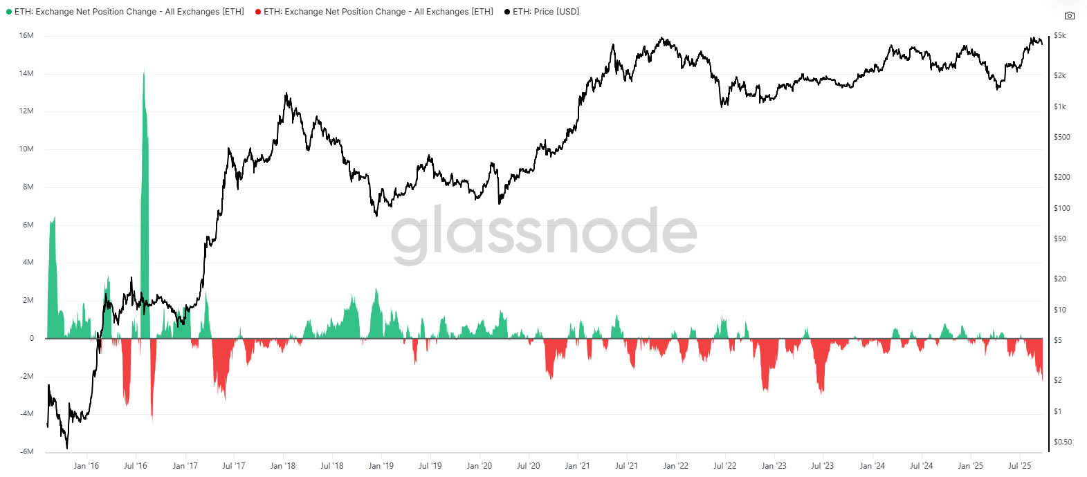 当外汇供应下降时,通常是资产被转移到冷库,下注或DeFi以获得更高收益的迹象。当外汇余额增加时,这通常是投资者准备卖出的迹象。 净流出正在增加CryptoQuant数据还显示,以太坊交易所总净流量的30天移动平均值本周达到2022年末以来的最高水平,表明流量加速。 “大规模提款通常表明转向自我托管或DeFi部署,减少了交易所流动性和即时抛售压力,”已评论CryptoQuant作者CryptoOnchain 同时,Glassnode的交易所净头寸发生变化显示周三负218万ETH。在过去十年中,它仅比这高出五倍。